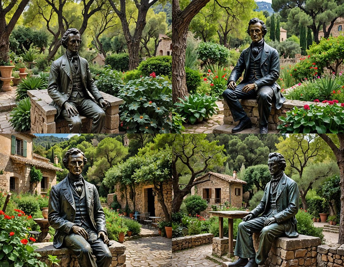 A hyperrealistic image of Frederic Chopin sitting in a garden near his cottage. The portrait captures the musician in a moment of reflection, rendered with sharp detail and strong lighting.