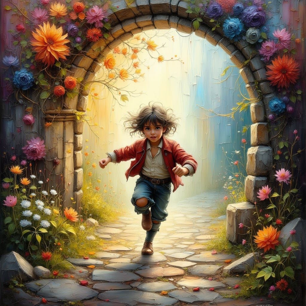 A young bohemian boy in a vibrant, richly embroidered prince jacket and antic clothes, his hair flowing freely and his clenched fists. He runs on a rustic stone tiles path towards the camera with a joyful expression on his face. He exits an enormous, luminous ethereal portal radiating light and a colored ...