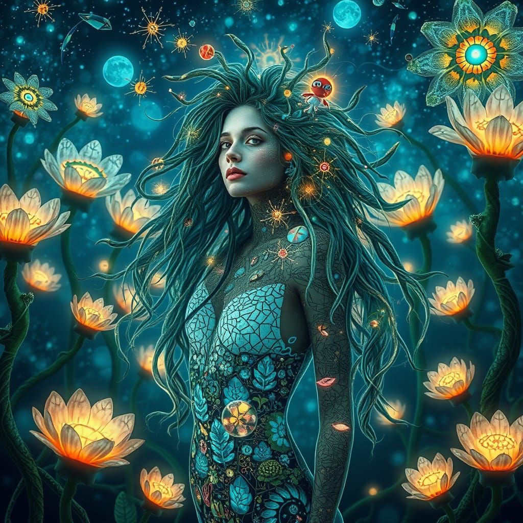 A surreal bioluminescent garden with flowers rooted in cracked mirrors, reflecting a dreamlike realm populated by mythical creatures. A woman with glowing hair stands at the center in this bio art collage, illuminated in ethereal light.