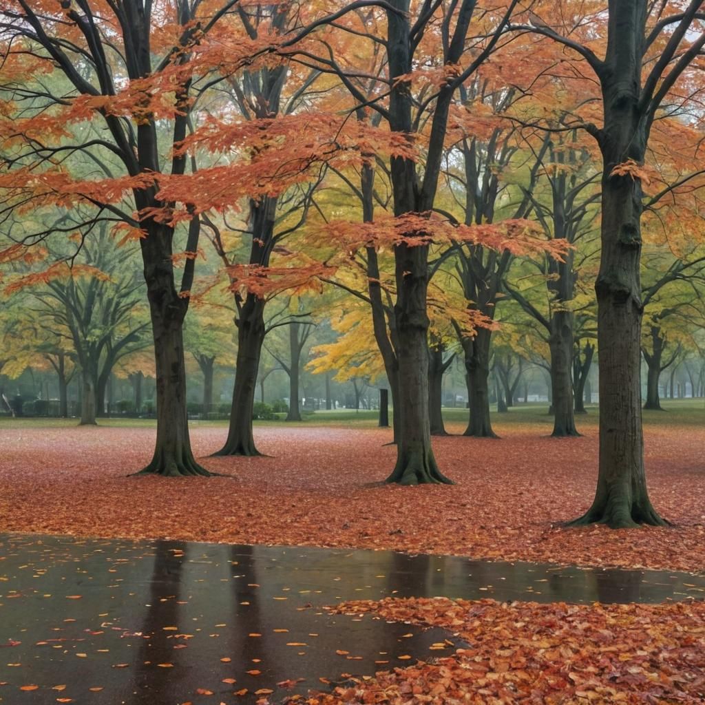 This image shows maple trees in a park during a rain shower. The scene evokes an autumnal aesthetic with vibrant colors and a melancholic mood.