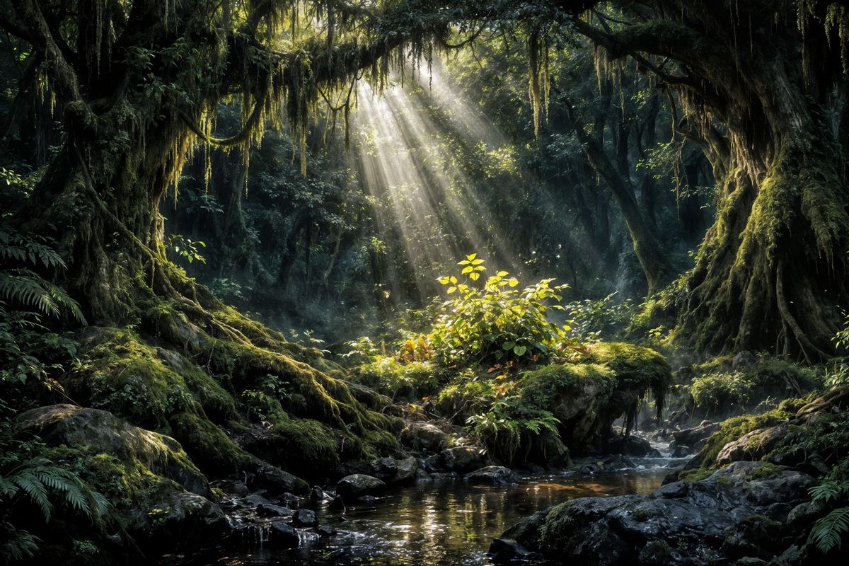 Over-detailed surrealism painting, detailed dense forest. Sunlight penetrates the foliage in only a few places, illuminating the leaves. volumetric lighting, ultra sharp focus, crystal clear, extreme contrast, VFX fine art, ultra CGI rendering, 16K, sparkling, vibrant, fantasy core, magical, hyperdetailed, ...
