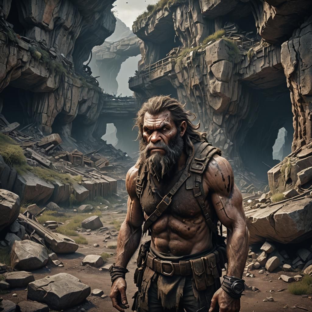 This image shows a post-apocalyptic portrait of a caveman amidst ruins. The scene evokes a cinematic feel with intricate detail, dynamic lighting, and a dark, muted color palette.