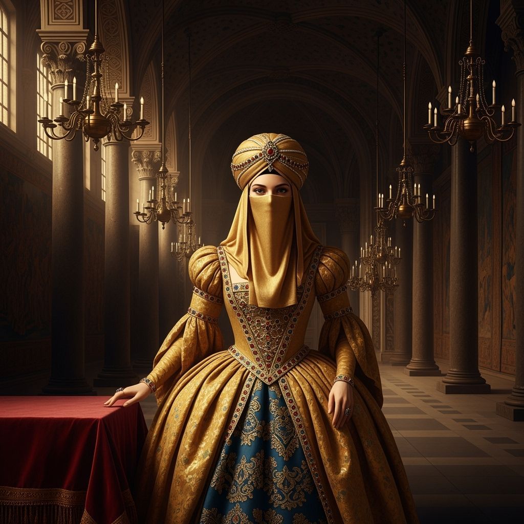 A regal princess in a Renaissance-style portrait, wearing a golden niqab, ornate ball gown, and jeweled turban. Set in a grand palace hall with dramatic chiaroscuro lighting.