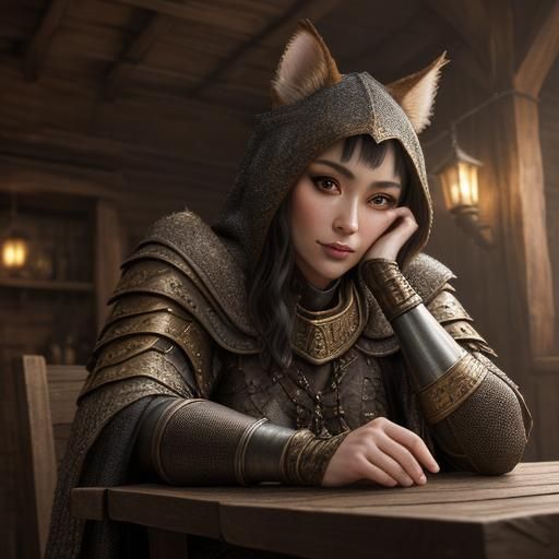 A striking picture of a Khajiit warrior at a tavern. The low-angle shot and muted palette create an intimate mood. This magical realist image is rendered as pointillist art.
