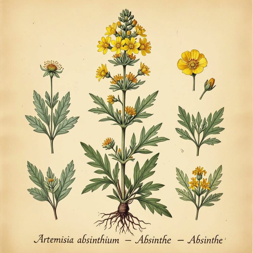 This image shows a detailed botanical illustration of a wormwood plant (Artemisia absinthium) with its root system, leaves, and flowers. The artwork is reminiscent of vintage herbarium plates.