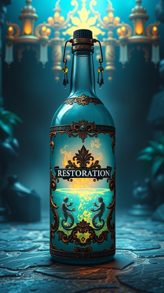 A detailed matte painting of a restoration drink bottle, designed as a healing potion. The fantasy concept art features deep, complementary colors in 8k resolution.
