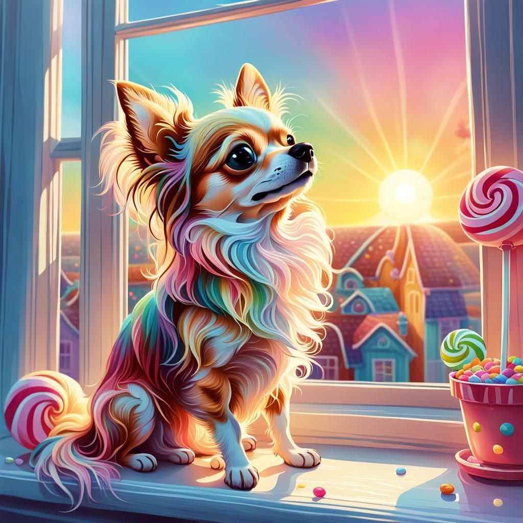 A digital illustration of a long-haired Chihuahua enjoying a sunrise from a window. Rendered in pastel colors, the image evokes happiness and light in a playful, candy-inspired aesthetic.