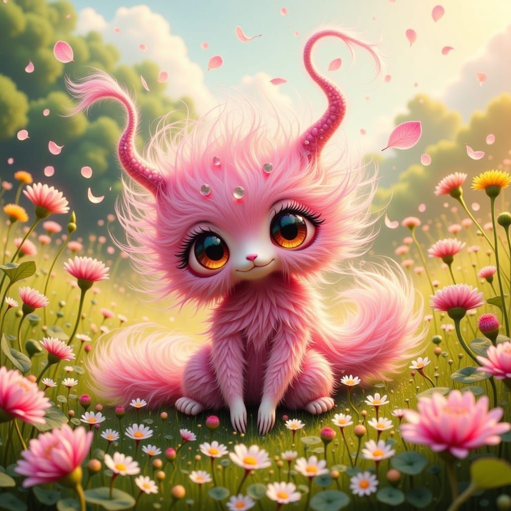 This enchanting image features a small, endearing creature with rose-petal pink fur and delicate patterns, set amidst a lush meadow filled with wildflowers and surrounded by warm sunlight and gentle petals, in a style reminiscent of fantasy art