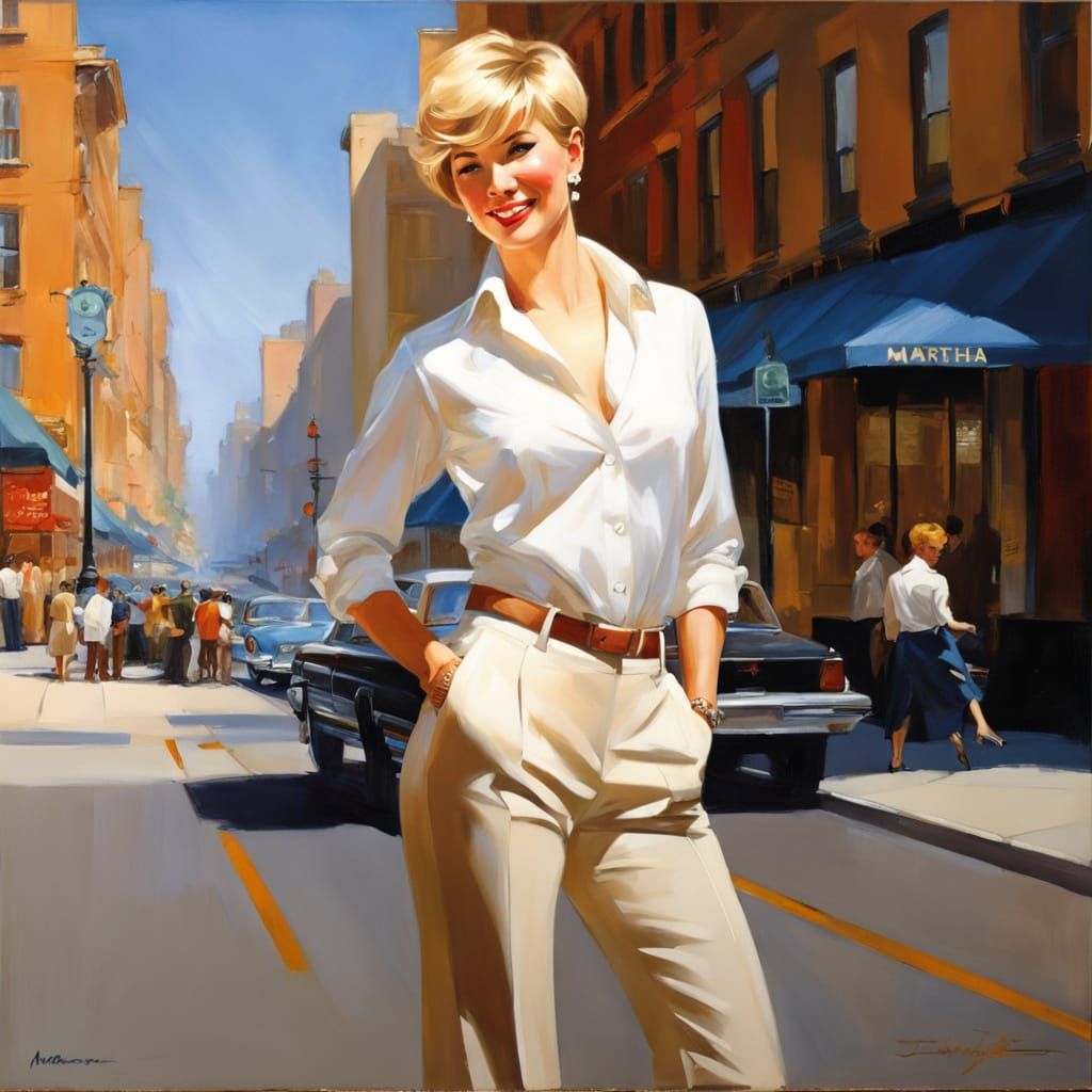 A full-length portrait of a confident woman walking down a city sidewalk. This impressionistic painting captures her joyful expression and stylish outfit with vibrant colors and detailed brushstrokes.