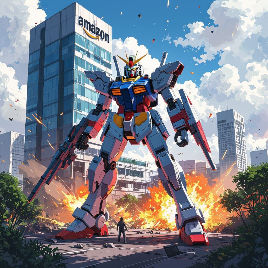 This image shows a Gundam robot, clad in futuristic armor, in the process of destroying the Amazon headquarters. The scene is rendered in a vibrant, cyberpunk aesthetic.