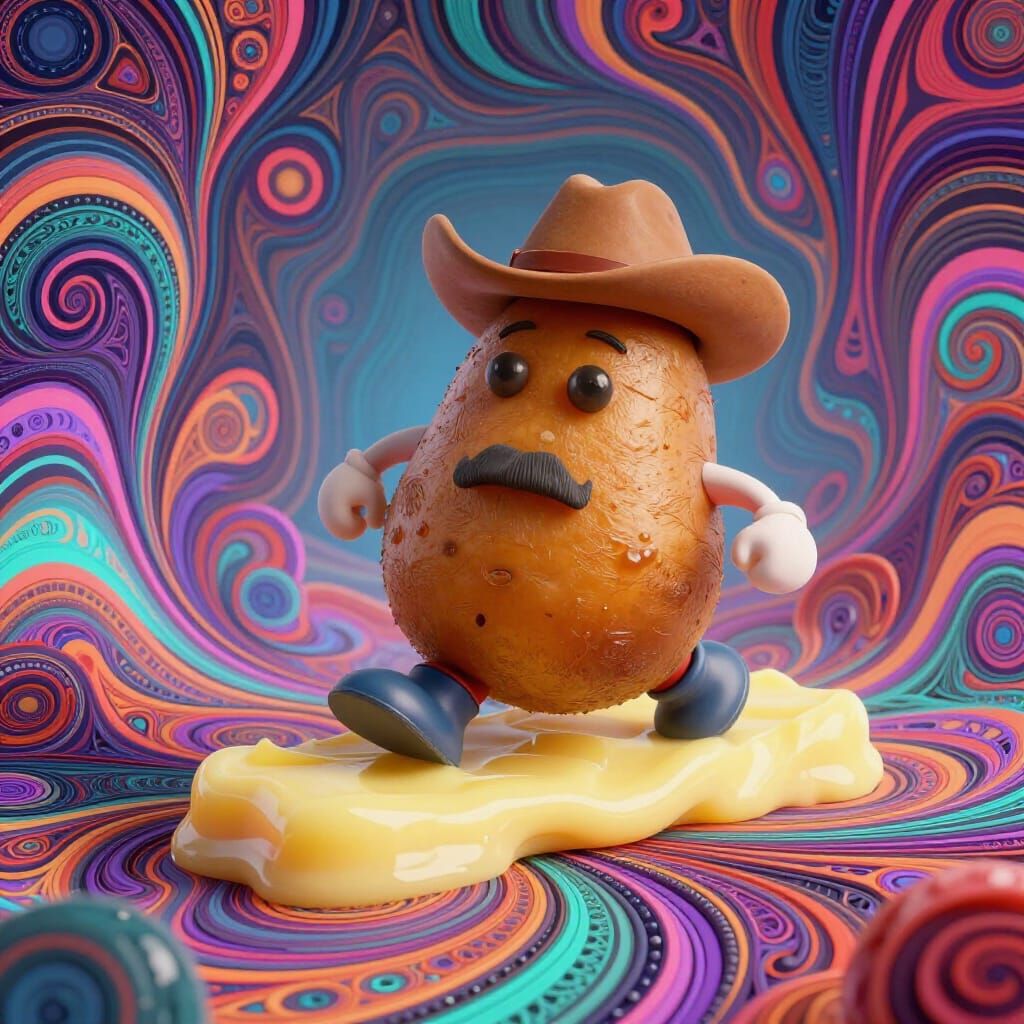 This surreal image features a potato cowboy on a butter stick, set against a vibrant abstract fractal landscape. Rendered in 3D with intricate patterns, it evokes a dreamlike quality.