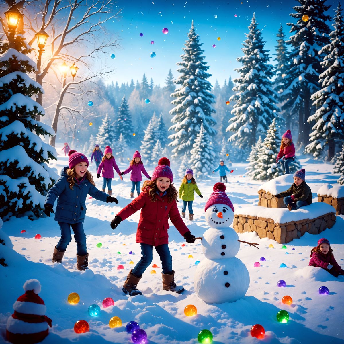 This image shows children joyfully creating snow figures in a magical winter scene. The artwork evokes a whimsical candy art style with dynamic lighting, vibrant colors, and shimmering reflections.