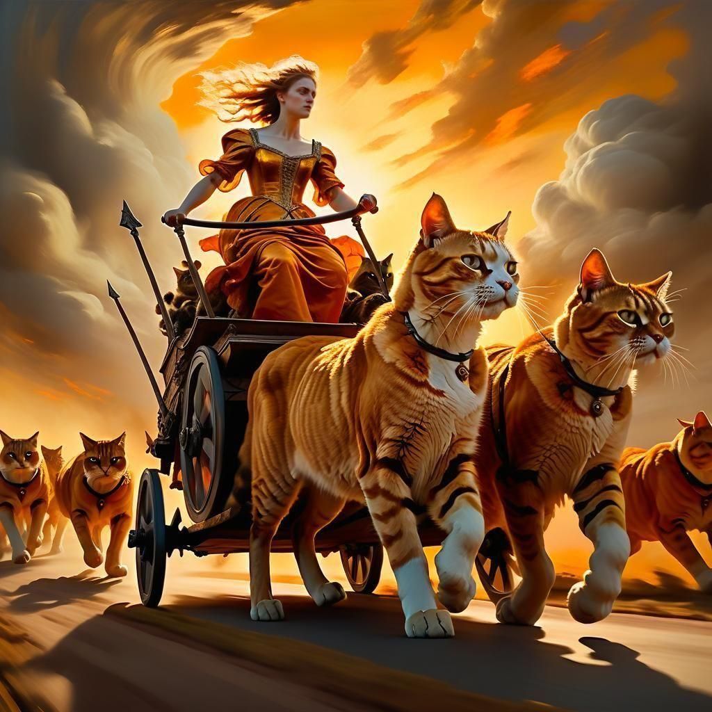"OIl-painting in the style of Da Vinci, Vallejo & Gentileschi of Freya, driving her chariot pulled by giant cats on the battlefield. Chaos is all around"