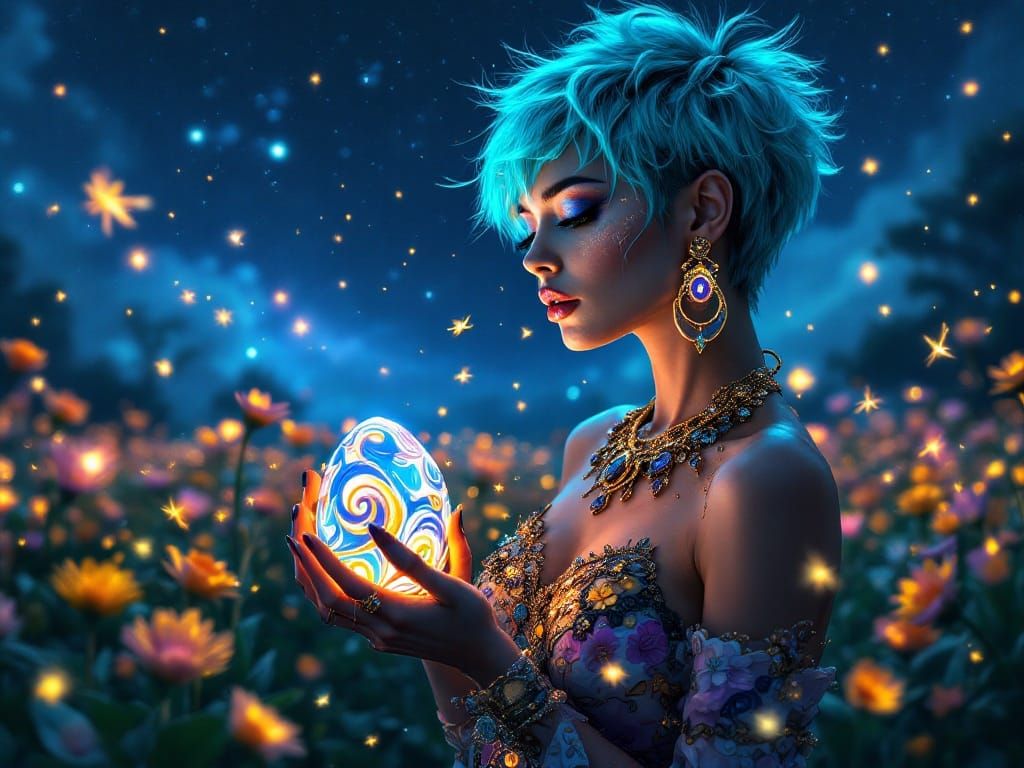 This enchanting image captures a mystical woman surrounded by bioluminescent flowers, fireflies, and a vibrant starry sky, holding an egg with abstract patterns, as she radiates magic and wonder.