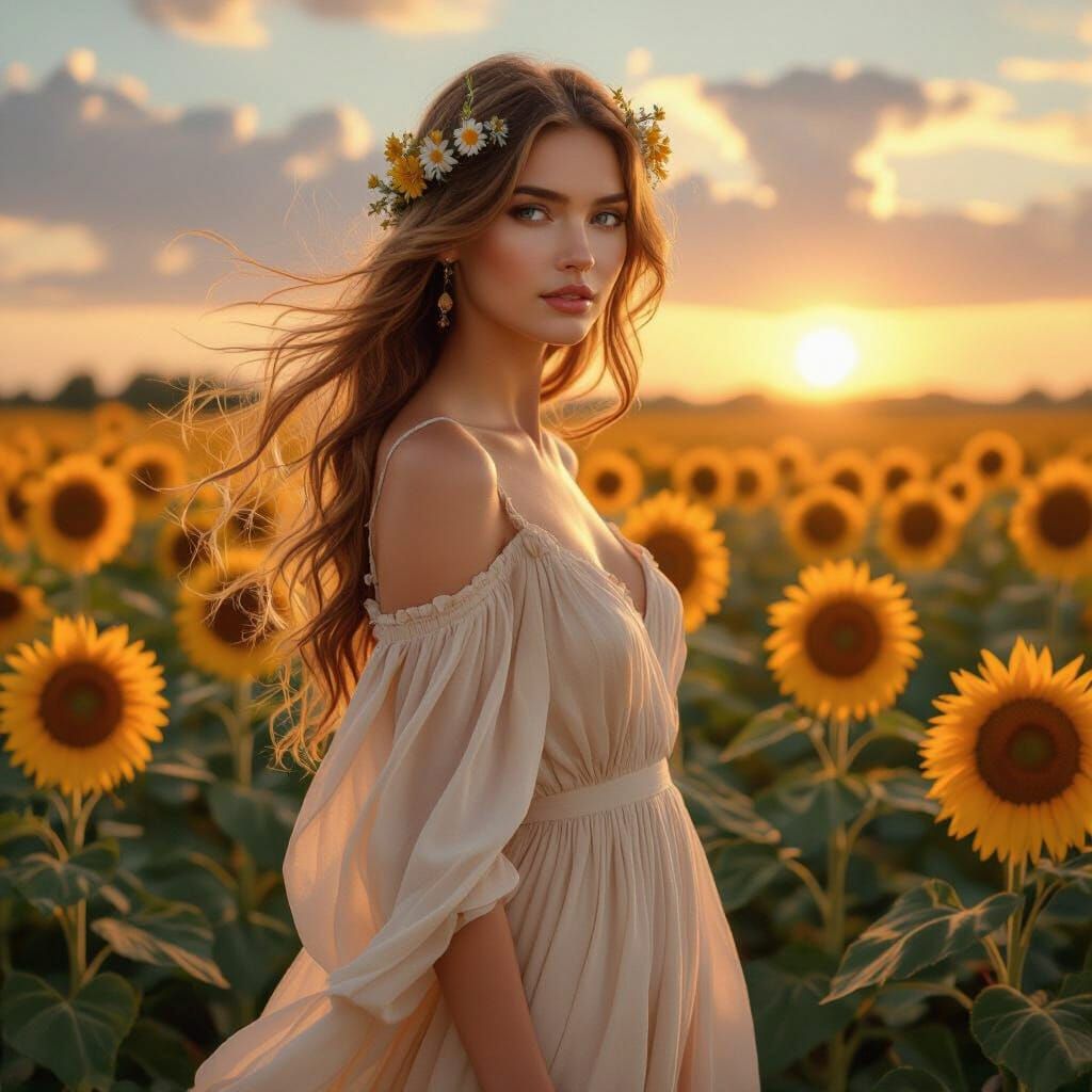 This image shows a European woman with golden hair in a sunflower field at dawn. The artwork is reminiscent of Renaissance paintings with soft, ethereal beauty and dramatic lighting.