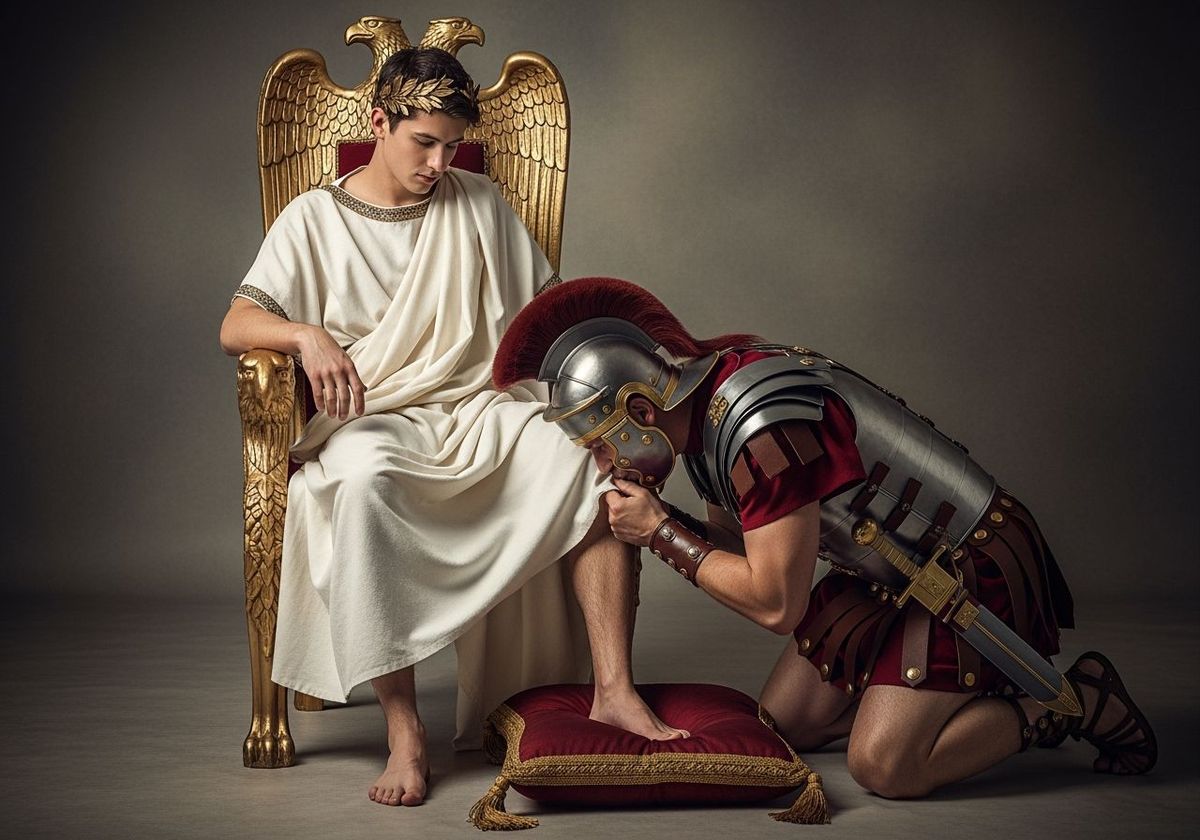 This image shows a youthful Roman Emperor seated on a golden throne, a soldier kneeling to kiss his feet. Soft lighting and a shallow depth of field enhance the scene, rendered in a dramatic photographic style.