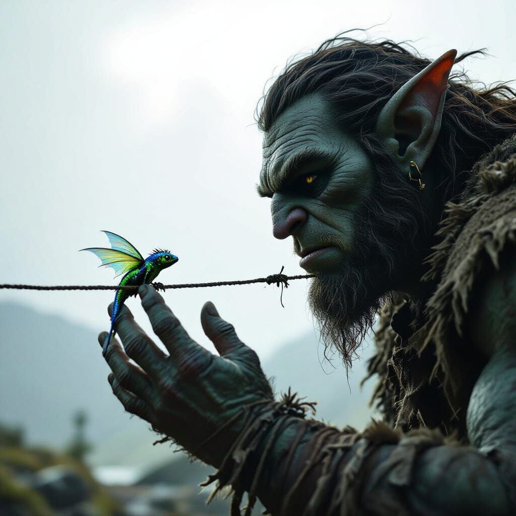 A cinematic film still captures a troll's hand nearing a tripwire, while a small dragonet whispers a warning from its shoulder. Features atmospheric lighting and film grain.