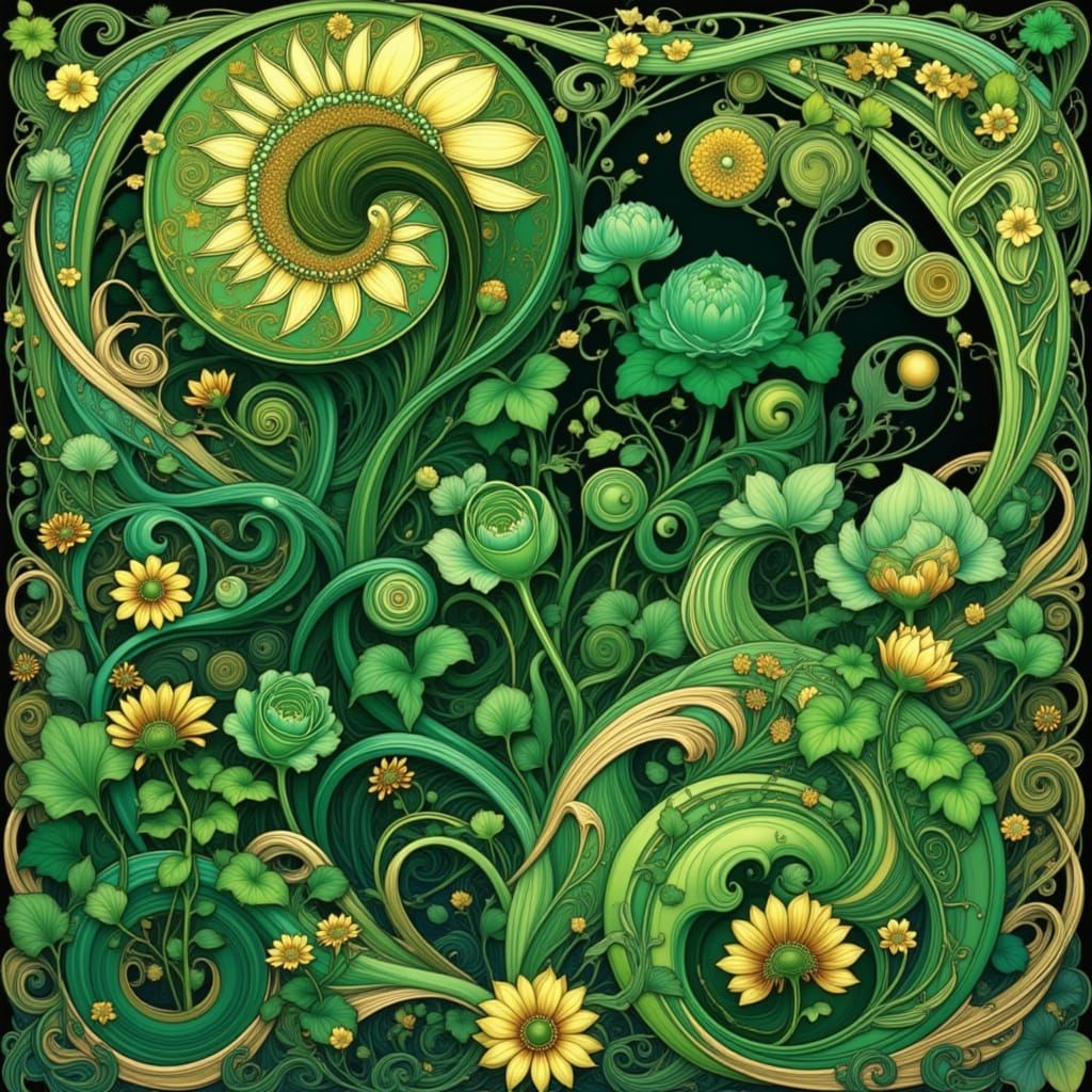 This ornate illustration showcases swirling botanical motifs in lush greens and gold, inspired by Art Nouveau masters. Featuring organic lines and flowing forms, it evokes natural elegance.