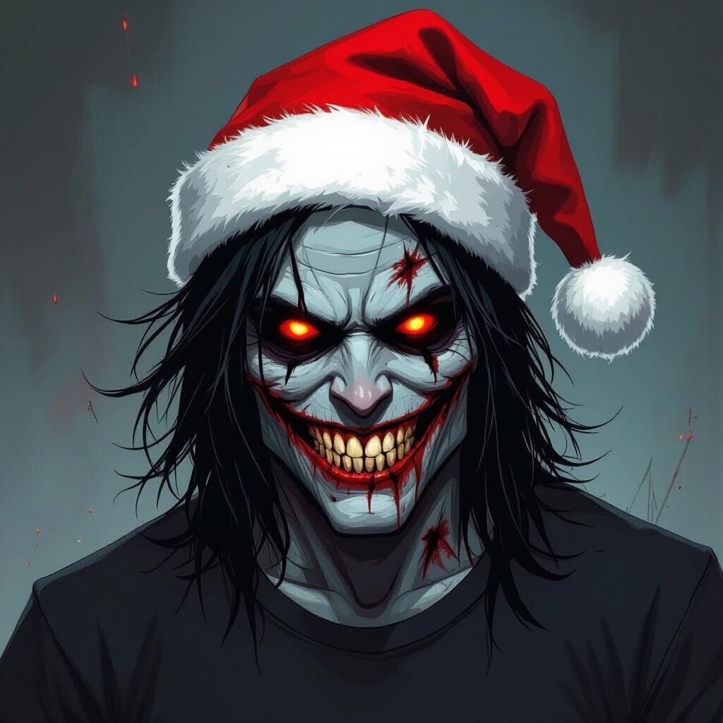This digital painting depicts a zombie superhero with grey skin, red eyes, and a Joker-like smile, wearing a Santa hat. It features bold lines and dramatic lighting, evoking a dark, gritty atmosphere.
