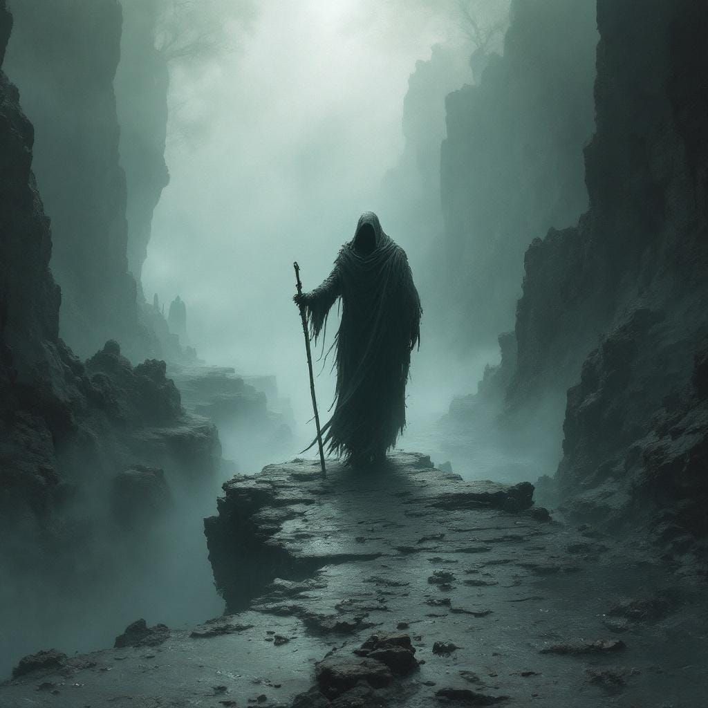 This image shows Charon ferrying souls across the River Styx. The dark fantasy scene features the ferryman in tattered robes amidst eerie fog, rendered with a haunting aesthetic.