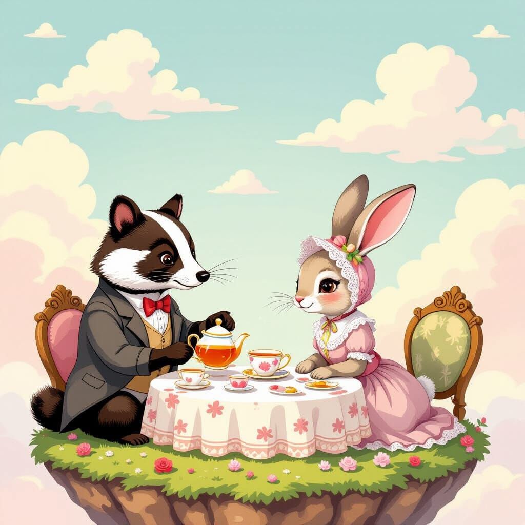 This image shows anthropomorphic animals enjoying a serene tea party on a floating island amidst pastel clouds. Rendered in a charming storybook illustration style with soft, painterly textures.