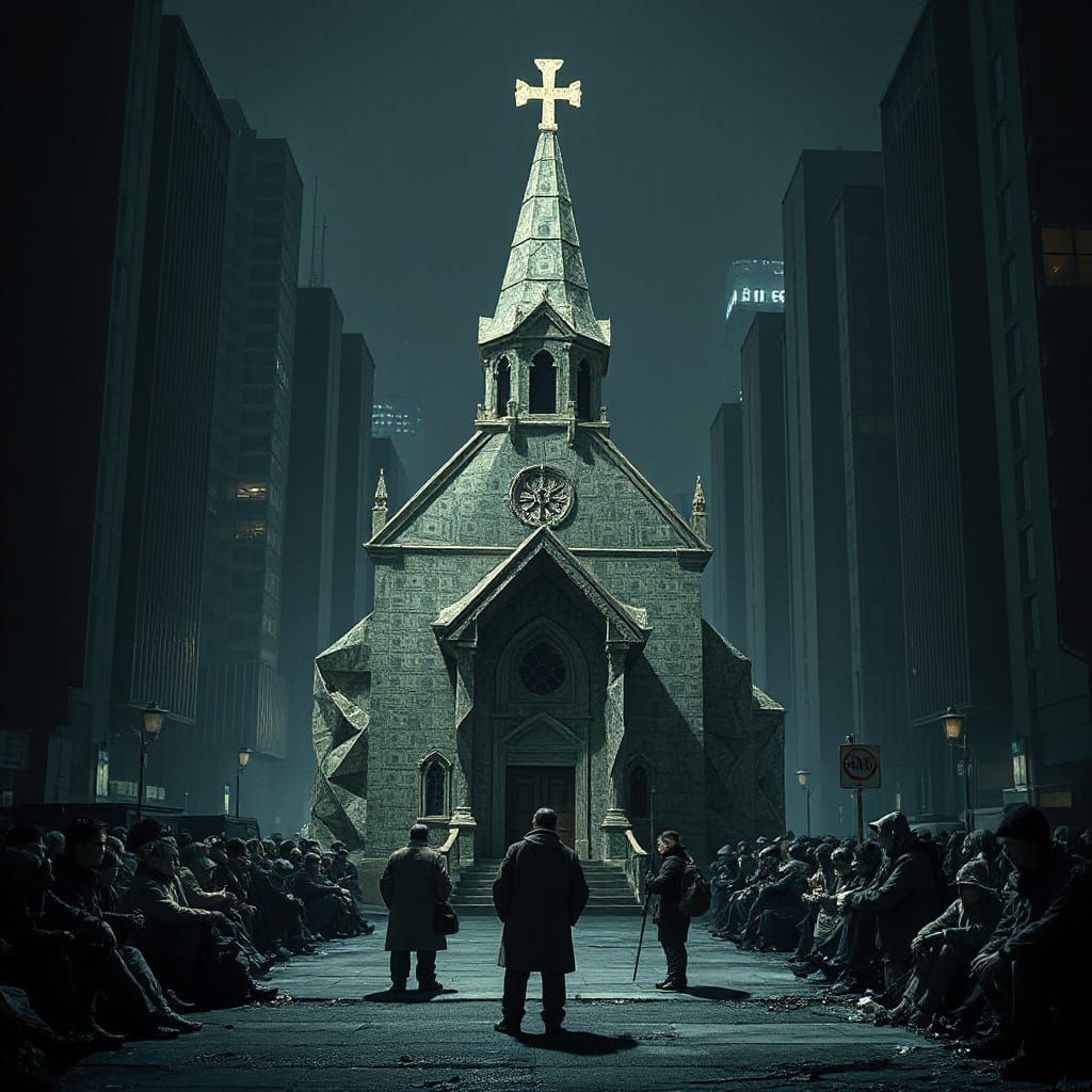 A hyperrealistic matte painting depicts a church made of origami money, with homeless figures outside suffering under malevolent light and deep shadows in a gritty atmosphere.