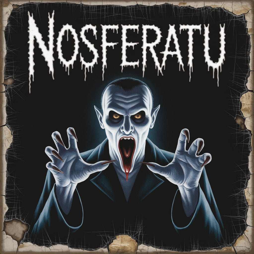 This eerie image shows a haunting, old-fashioned horror poster with a Nosferatu figure emerging from shadows, set in a desaturated, gothic aesthetic with sepia tones and weathered textures.