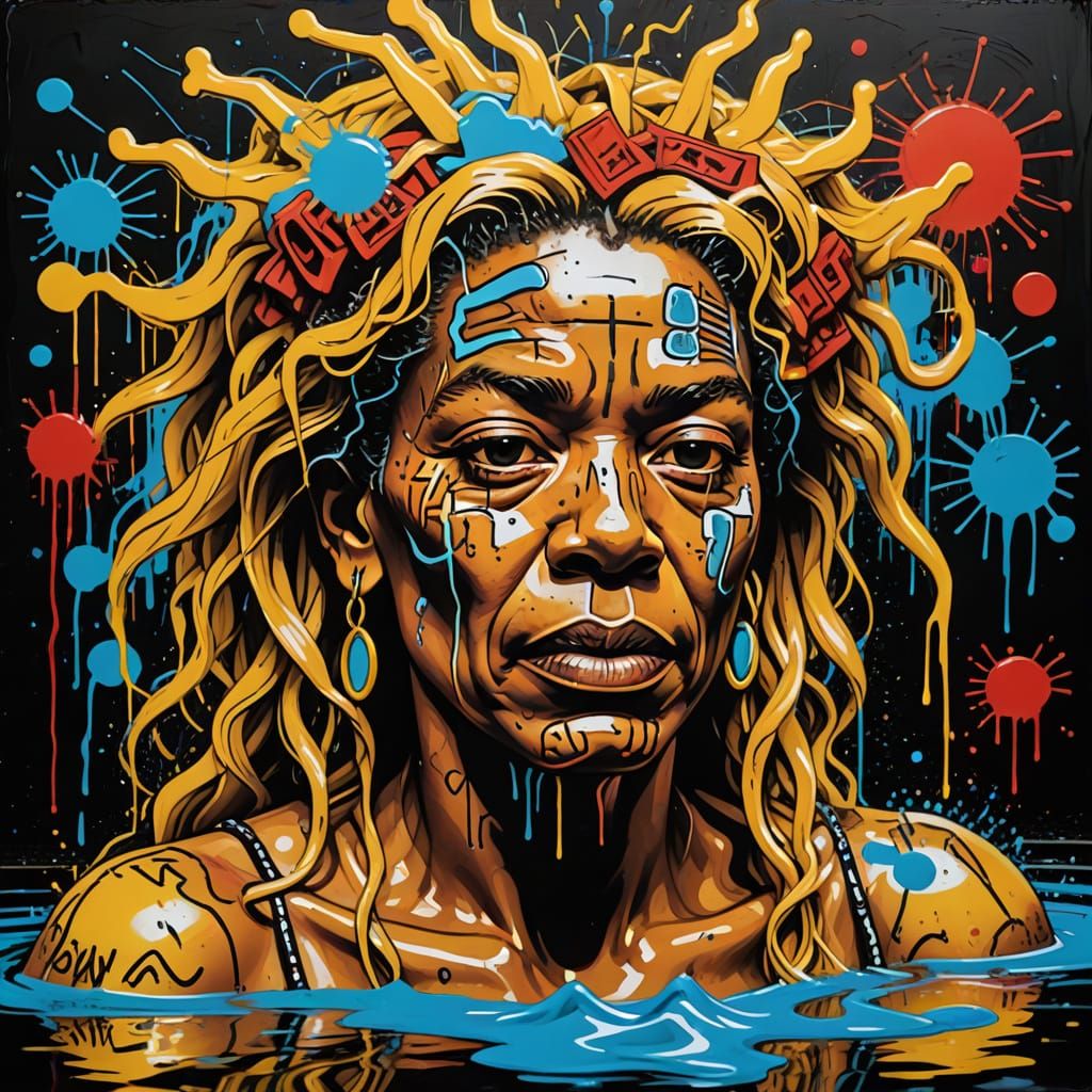 This image depicts an elderly woman, embodying the spirit of the maiden goddess Diana, as she bathes in a serene woodland pond. The scene is rendered in vibrant colors and bold lines, blending traditional and street art styles with a mix of textures and mediums, evoking the works of Jean-Michel Basquiat ...