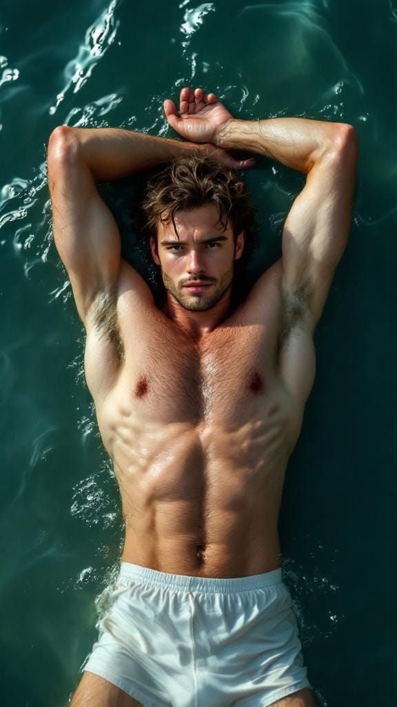 This image shows a slender man reclining in shallow water. Shot from above, the photo features soft lighting and a sharp focus, creating a natural, photorealistic aesthetic.