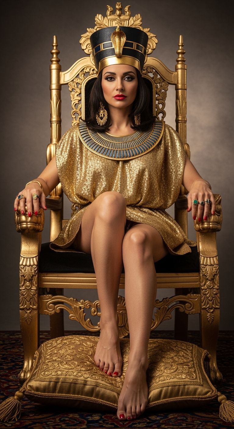 This image shows an Egyptian queen in a golden toga, adorned with jewelry and a cobra crown, sitting barefoot on a gold throne. The professional studio shot features natural lighting and a bokeh effect.