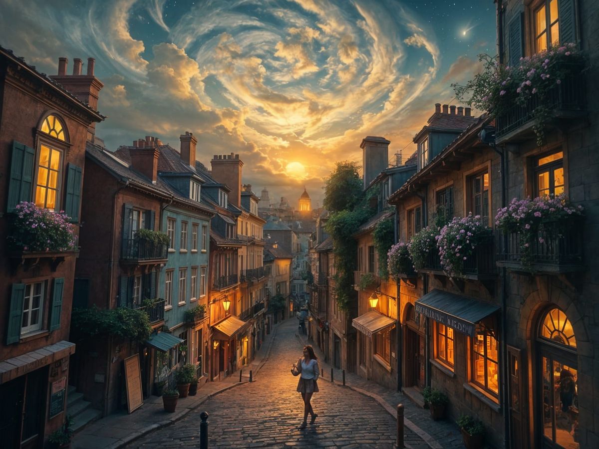 A digital artwork showing a woman walking through a historic neighborhood with colorful buildings and rooftop gardens. The scene is bathed in warm light, under a swirling, starry night sky in a dreamlike digital art style.