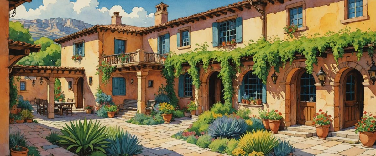 A vibrant scene of a stone pueblo hacienda with a courtyard, rendered in watercolor and gouache. The image features a comic book style with bright colors and volumetric lighting.