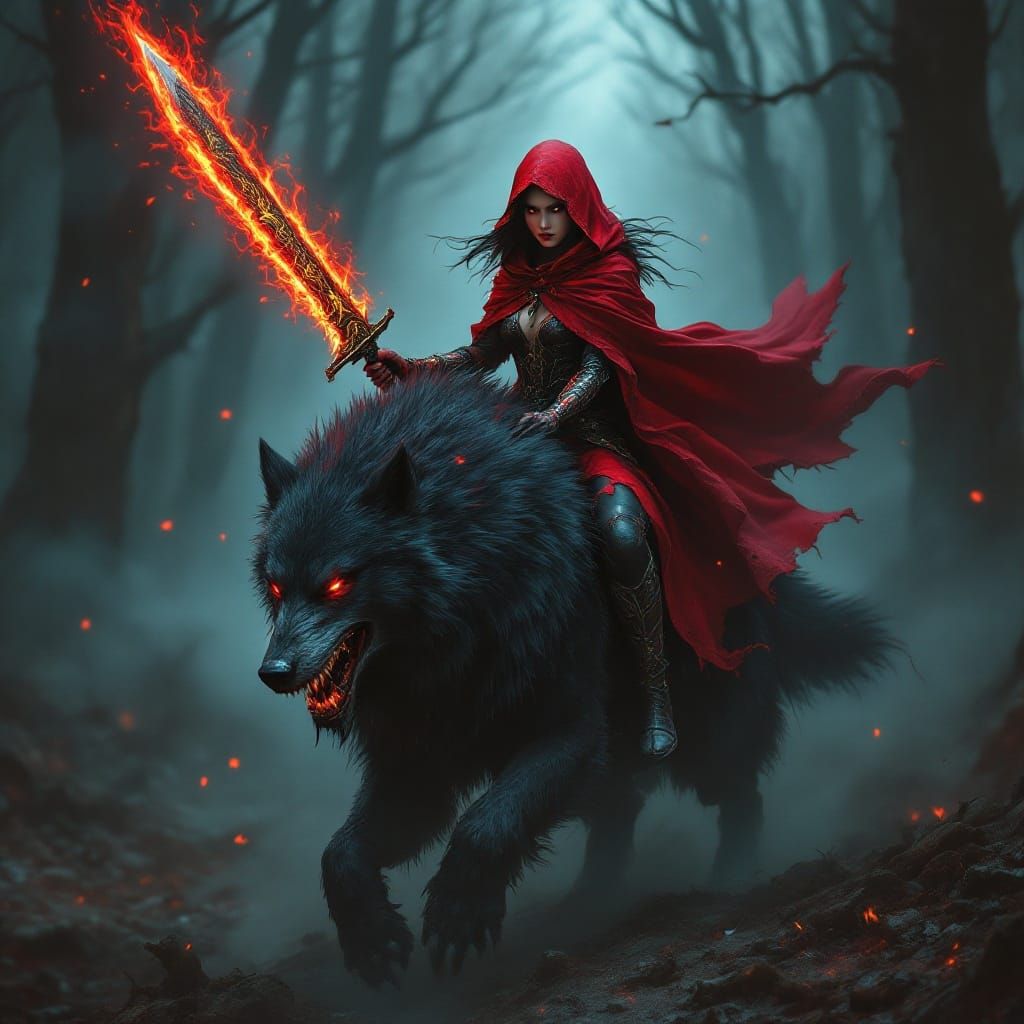 This image shows a ravishing supermodel assassin riding a massive, battle-scarred dire wolf through a smoke-choked, apocalyptic forest. She wields a fierce, flame-imbued sword and her iconic crimson cloak flows behind her like a banner of bloodlust.