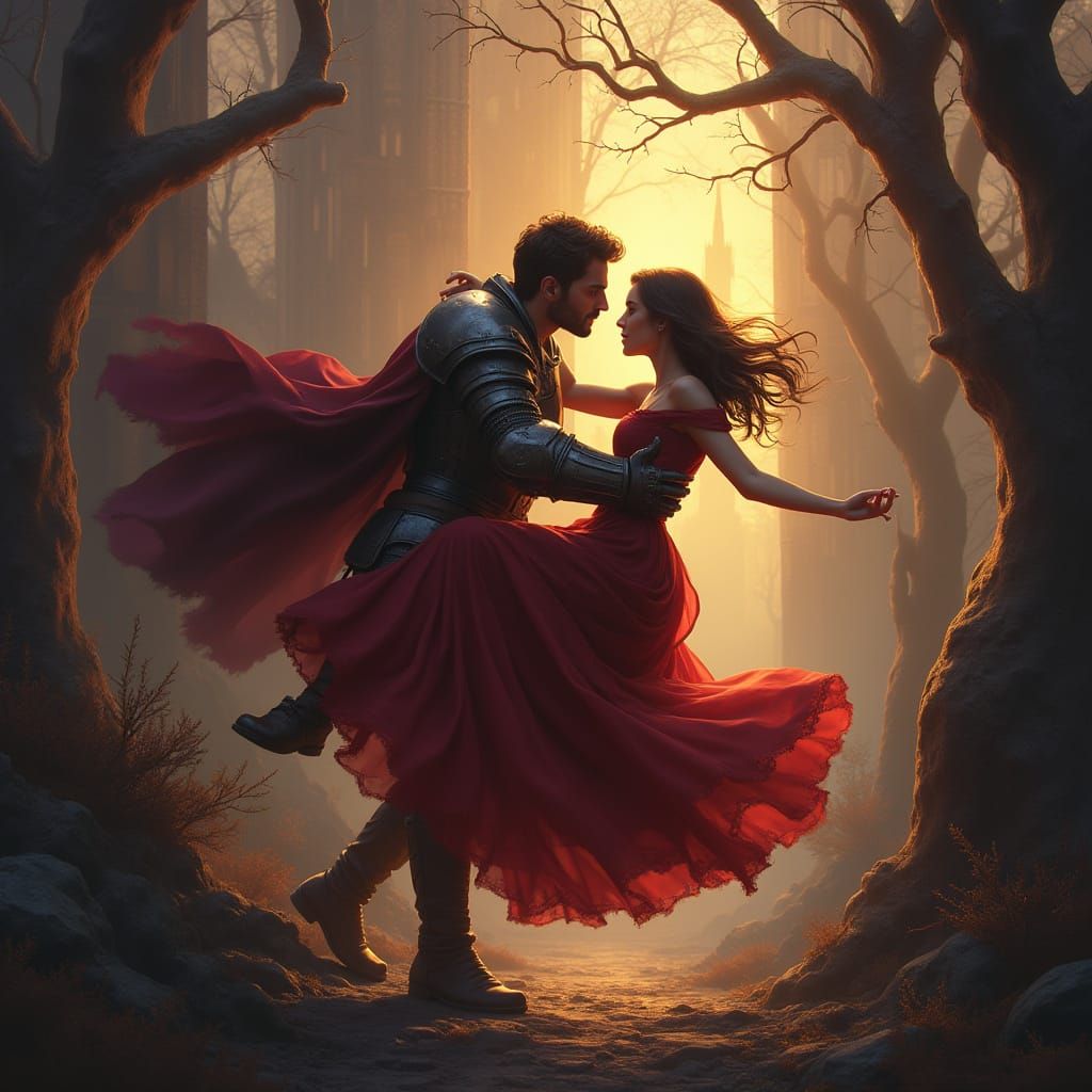 This image shows a knight rescuing a woman in a dark fantasy world. Golden light illuminates crumbling Gothic architecture and twisted trees in a detailed matte painting with rich purple and yellow hues.