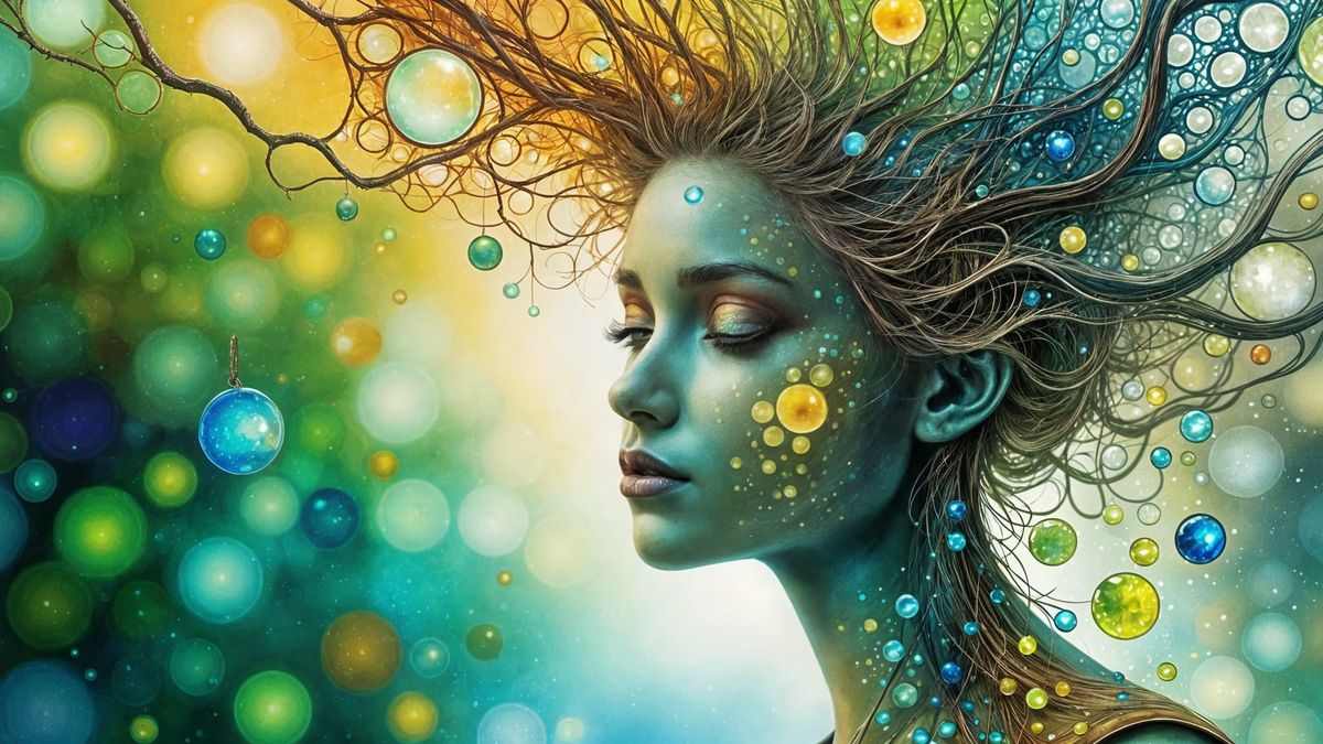 A surreal digital artwork featuring a woman wearing a beautiful lime green necklace. The image is abstract and dreamlike, with a mist-like gradient and symbolic elements.