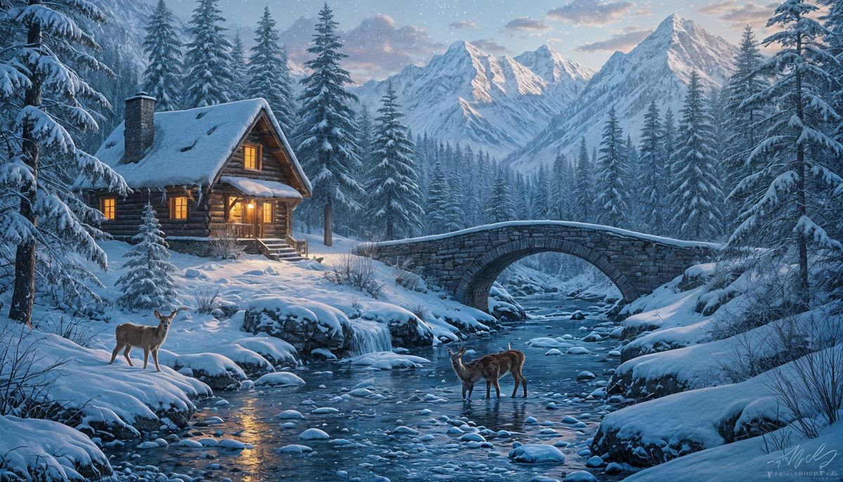 This image shows a serene winter scene with a snow-covered cabin, a mountain stream with ice, and a deer drinking. Rendered with intricate detail and cool, complementary colors in a matte painting style.