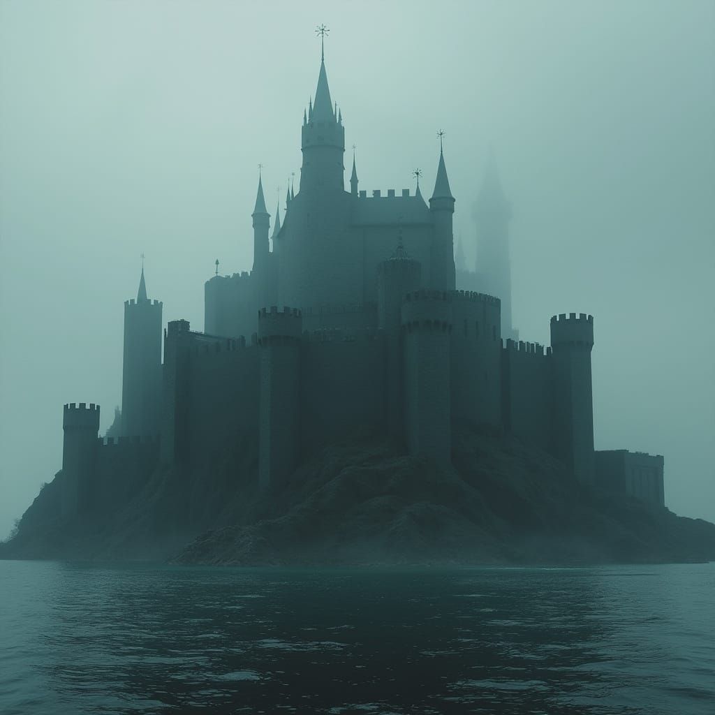 A towering, ominous castle with dark gothic architecture stands on a flat island. The castle's design evokes a sense of foreboding and ancient evil, rendered as digital art.