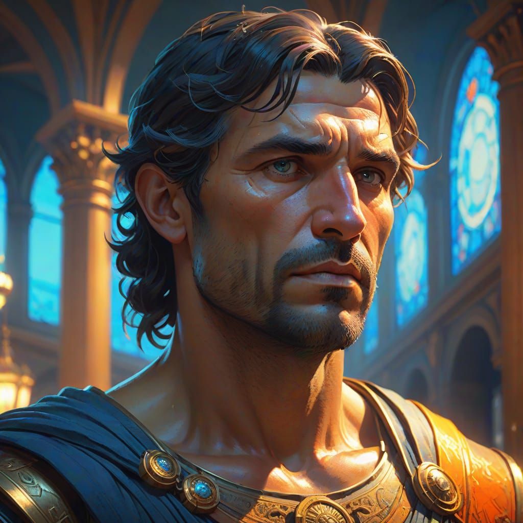 A detailed portrait of Orion, a determined ancient Greek man seeking justice. This stunning digital artwork features dynamic lighting, hyperrealistic textures, and a vibrant triadic color palette.