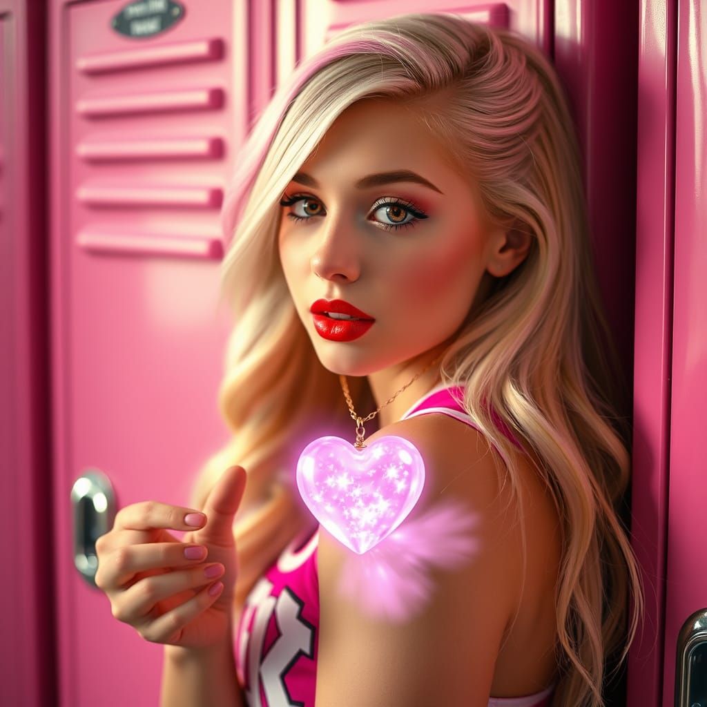 A beautiful blonde cheerleader with pink highlights leans against pink lockers, mesmerized by a floating heart pendant. This digital artwork features cinematic lighting and a dreamy, ethereal atmosphere.