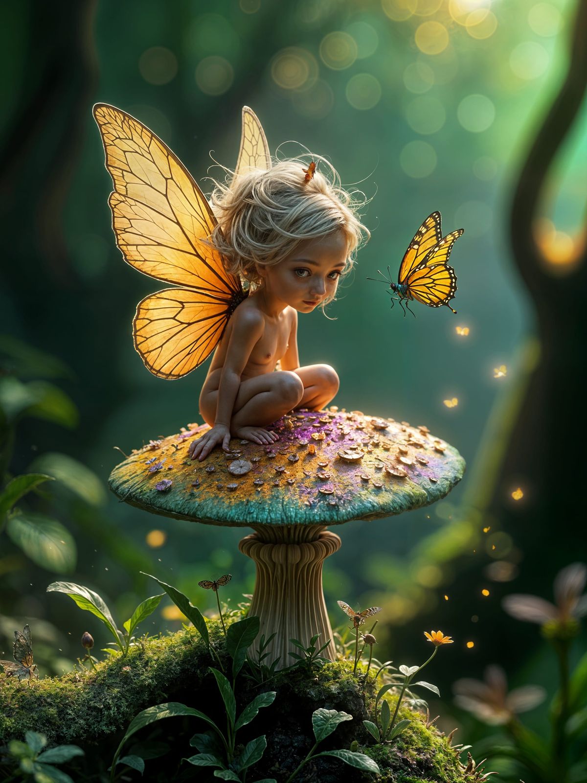 This enchanting image features a delicate fairy amidst a lush, colorful forest, complete with intricate mushrooms and butterflies, rendered in stunning hyper-realistic detail with cinematic lighting.