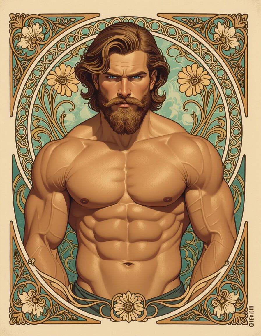 A portrait of an angry, muscular man with a beard and moustache. The artwork features flowing lines and floral patterns in an art nouveau style with surrealist elements. It is reminiscent of a charcoal drawing.
