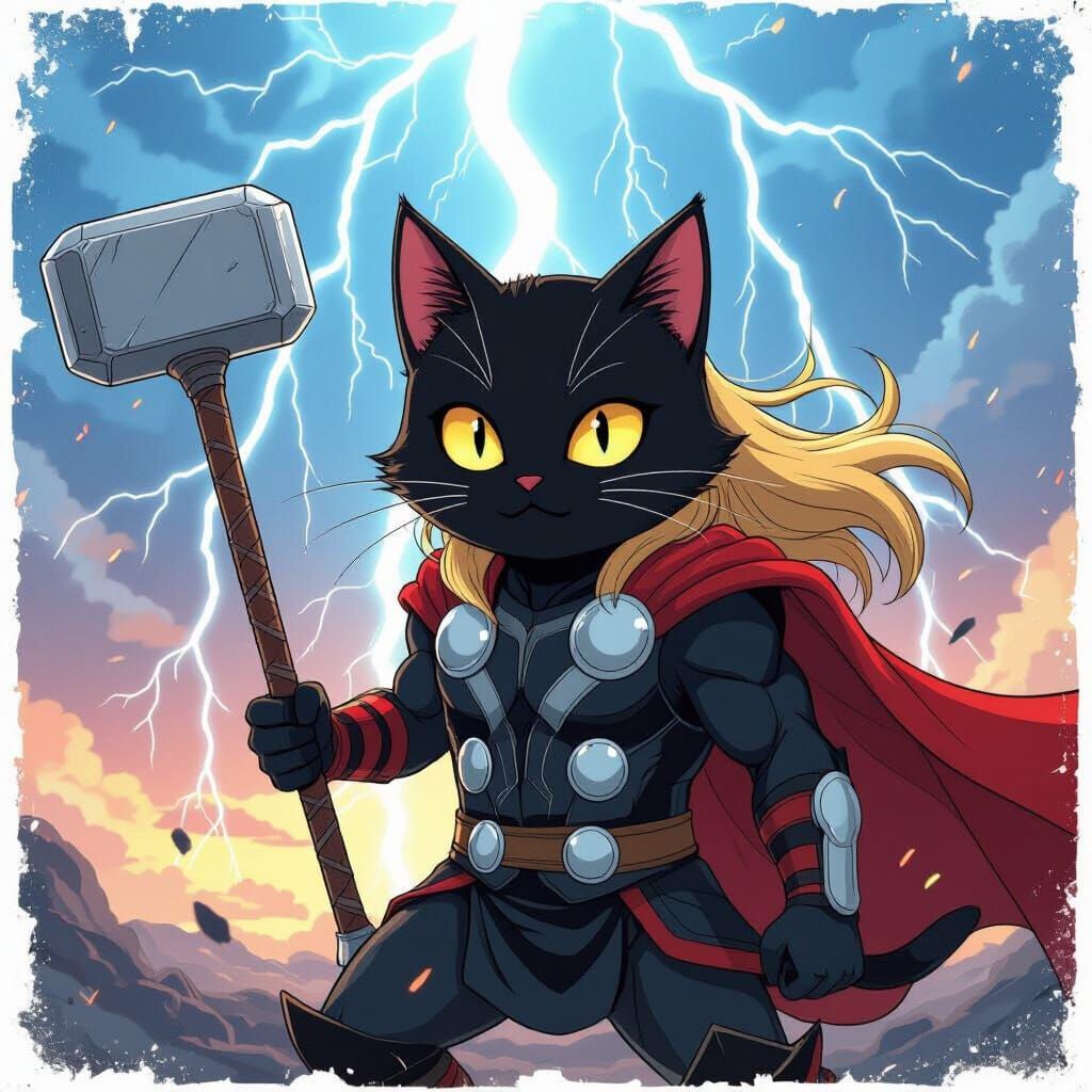 This image shows a full-body anime-style illustration of Thor with a black cat's face, holding Mjölnir against a vibrant, lightning-filled sky. It features dynamic linework and saturated colors.