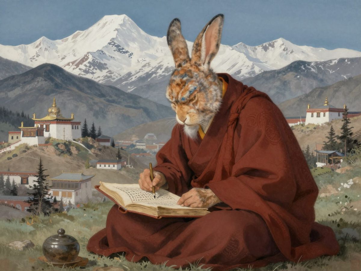 This image shows a wise rabbit monk intensely concentrating on an ancient book within a secluded Tibetan monastery. Rendered in a painterly style with Japanese landscape influences.