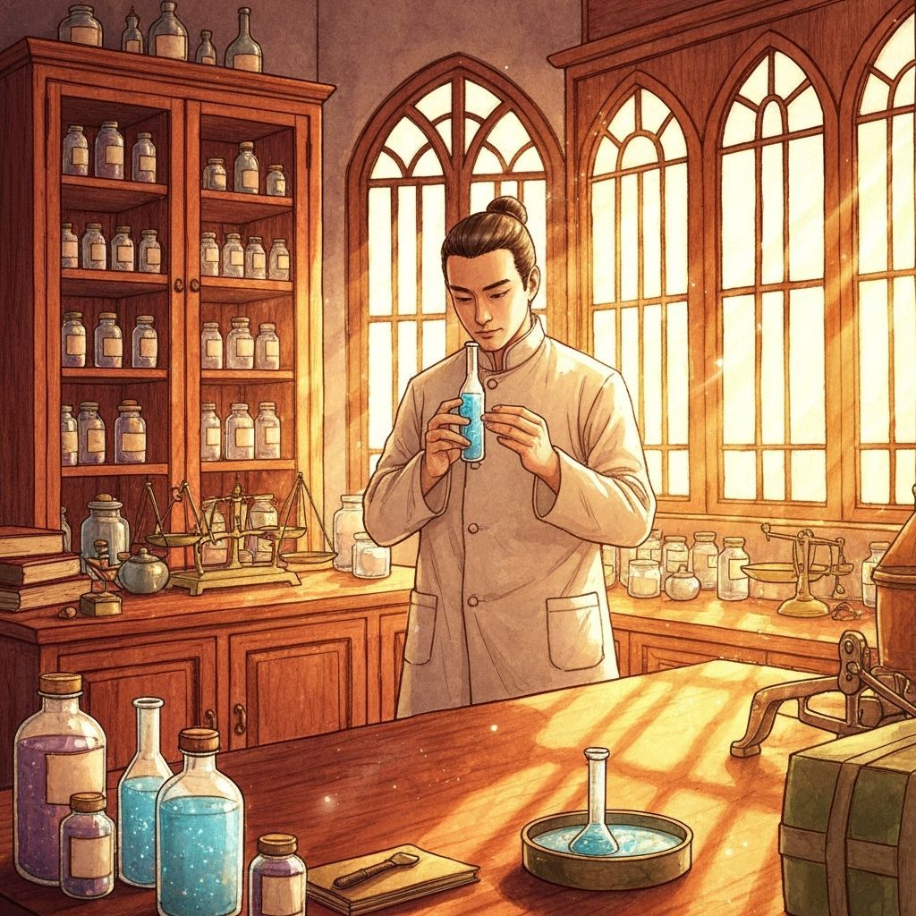 This image shows Maomao, an apothecary, in a Chinese-inspired setting filled with ancient books. The artwork features warm lighting and hand-drawn details with soft watercolor textures.
