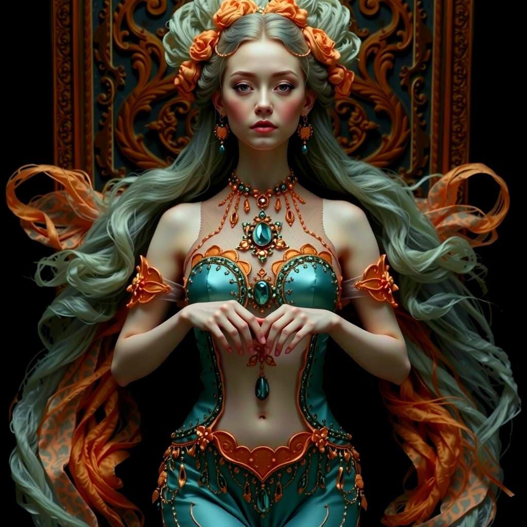 This image shows an elegant photorealistic creation featuring interwoven ringlets and tendrils in shimmering sky blue, sea green, pink, and orange tones, resembling satin and silk.