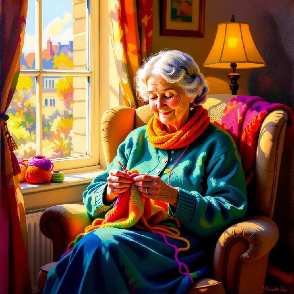 This image depicts an elderly woman peacefully knitting with colorful yarn in a cozy armchair. Rendered in a textured oil painting style with visible brushstrokes and vibrant colors, it evokes a sense of warmth and tranquility.