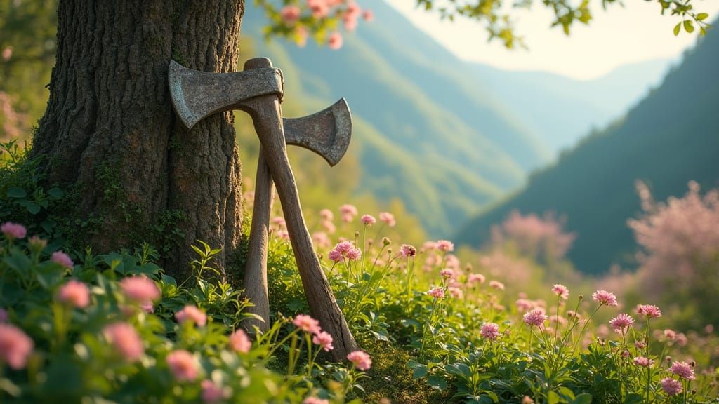 A serene mountain landscape featuring a lush garden filled with colorful flowers in soft, warm light. This photorealistic image, reminiscent of impressionist paintings, captures a tranquil summer scene.