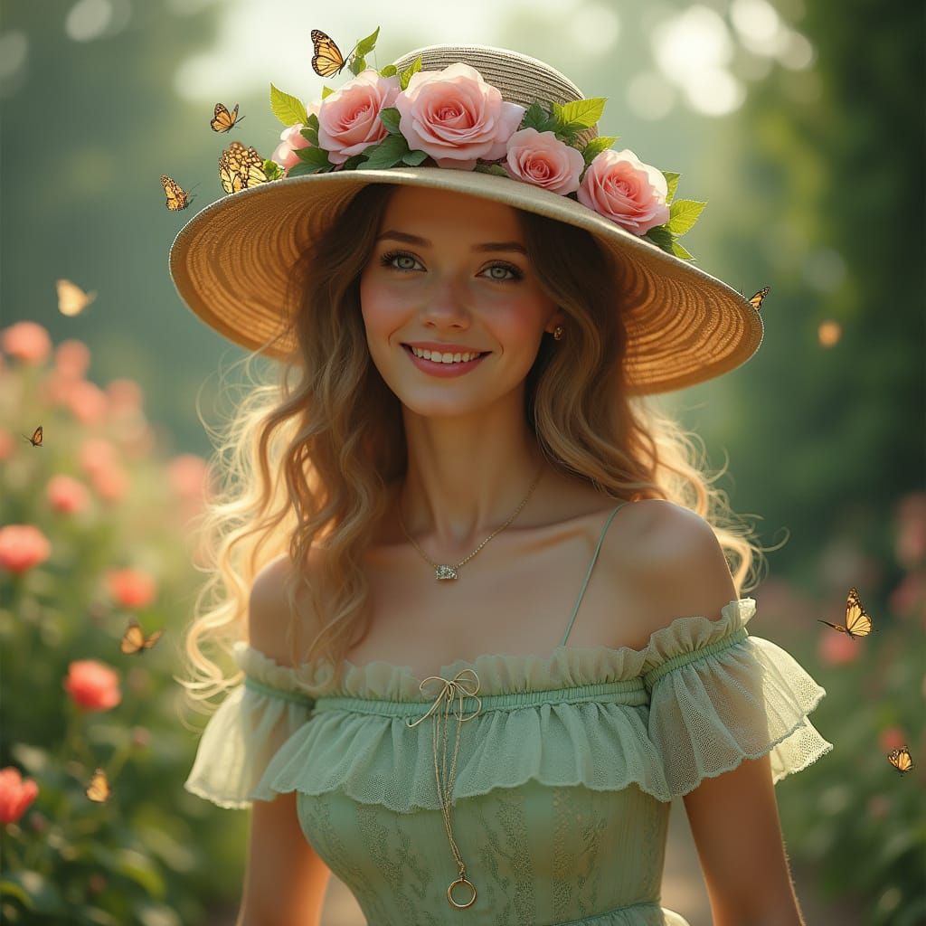 A portrait of a smiling European woman with wavy hair and a rose-decorated hat. She wears a green lace dress and walks toward an English garden in soft light. The image is rendered with dynamic lighting and ornate elegance.