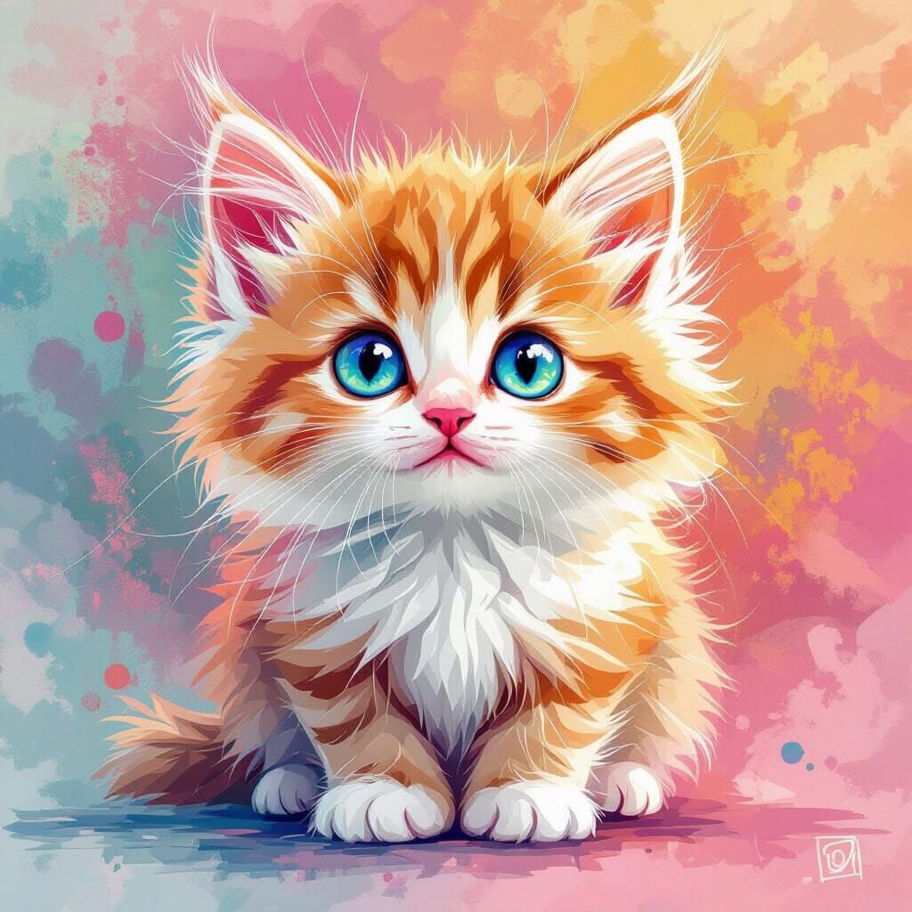 A striking picture of a fluffy kitten with large blue-green eyes and soft orange, white, and pink fur. The background is a colorful abstract blend of vector and watercolor styles.