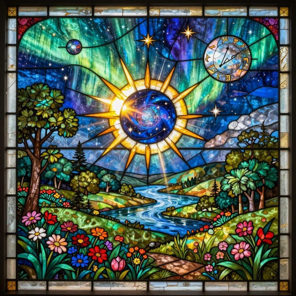 This image showcases a magnificent stained glass window of a lush valley. It features a solar eclipse, aurora borealis, celestial spheres, and crystal-like stars with alchemical and zodiac symbols.